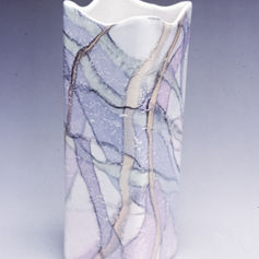 Early colored clay work had thin veneers of color. As I kept getting the veneer thinner to save material, the layer began to become transparent and began to separate. This work then took advantage of the transparency and separation to create a more fluid design.